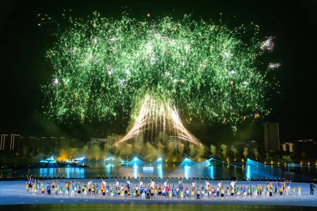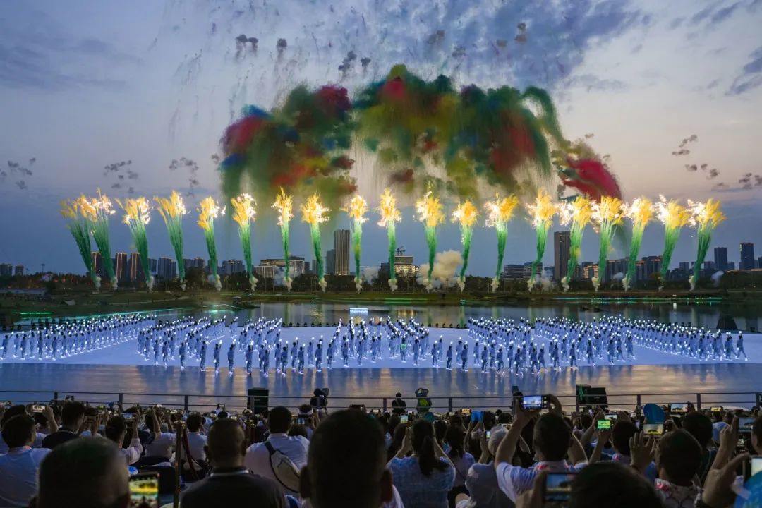 當(dāng)然,喬衛(wèi)口中的“繽紛”,并不僅僅來自于舞臺(tái)的光彩奪目、焰火絢爛。碧的水,綠的草,錯(cuò)落的城市天際線,以及從晚霞到夜幕的天空,都是成就“繽紛”的重要色彩。